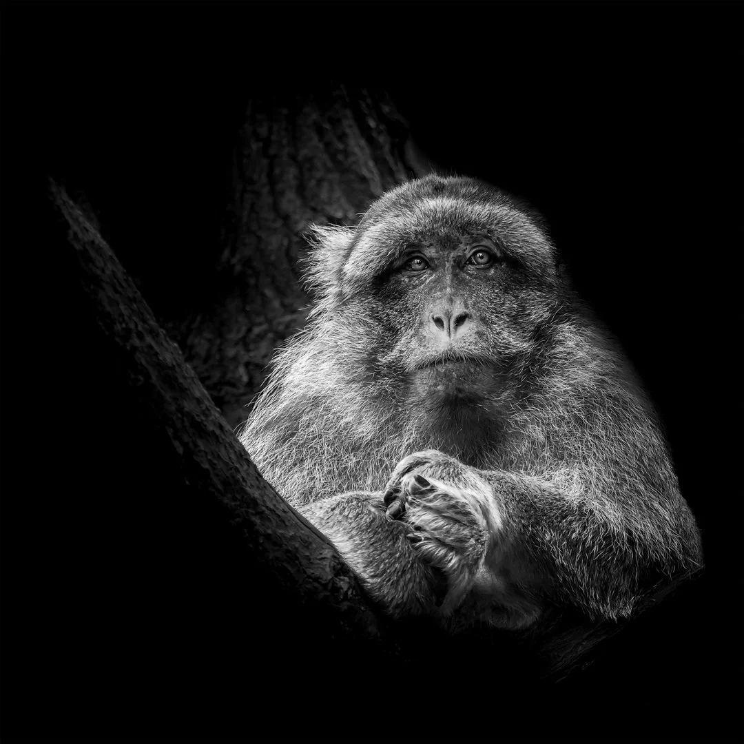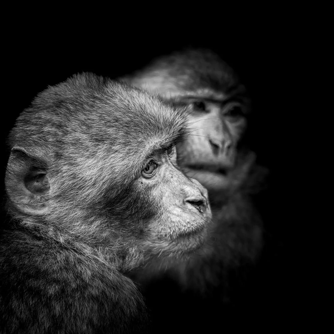 Elevate your interior decor with our stunning limited edition print, depicting two adult macaques in tranquil contentment. A timeless black and white piece that embodies serenity and elegance.