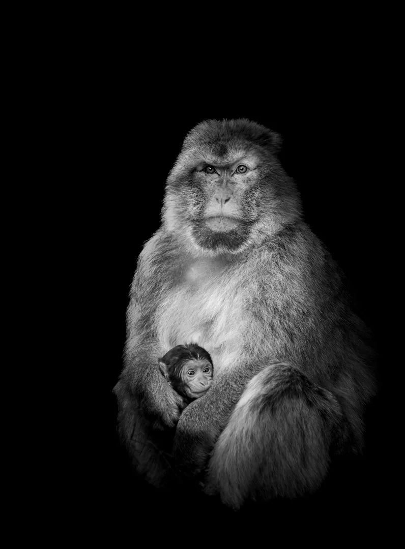 Experience the enchanting bond of nature with this captivating black and white fine art print featuring a tender moment between macaques, perfect for art lovers and wildlife enthusiasts alike.