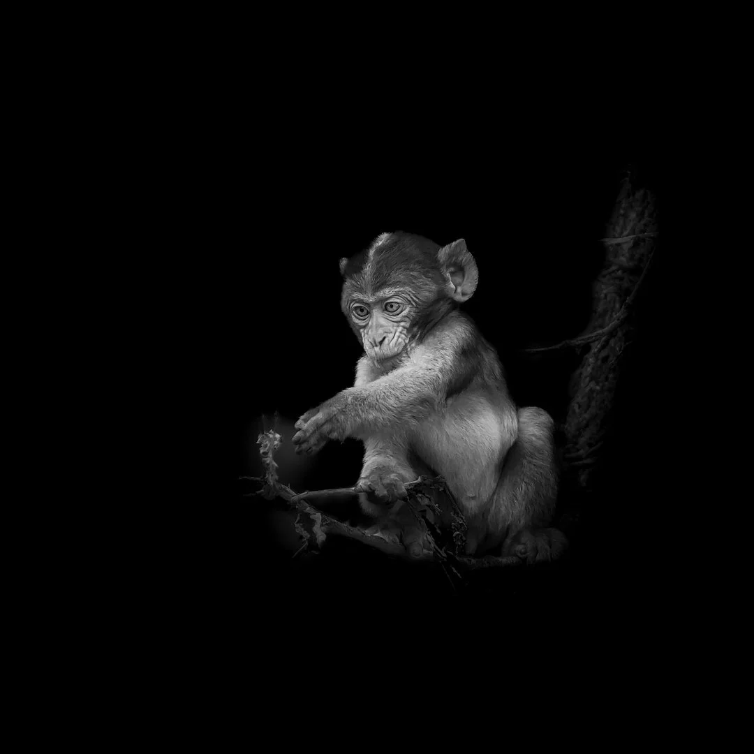 Capture the essence of nature's wonder with this stunning black and white print of an inquisitive infant macaque reaching out into the world. A beautiful piece that evokes curiosity and a sense of peace.