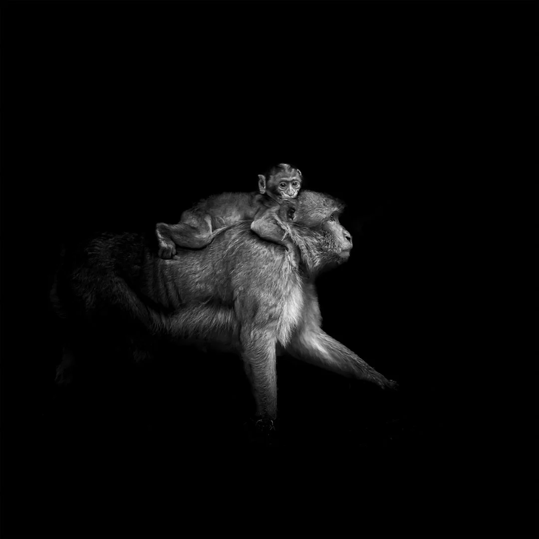 High-quality black and white fine art limited edition print depicting an infant macaque riding on an adult's back.