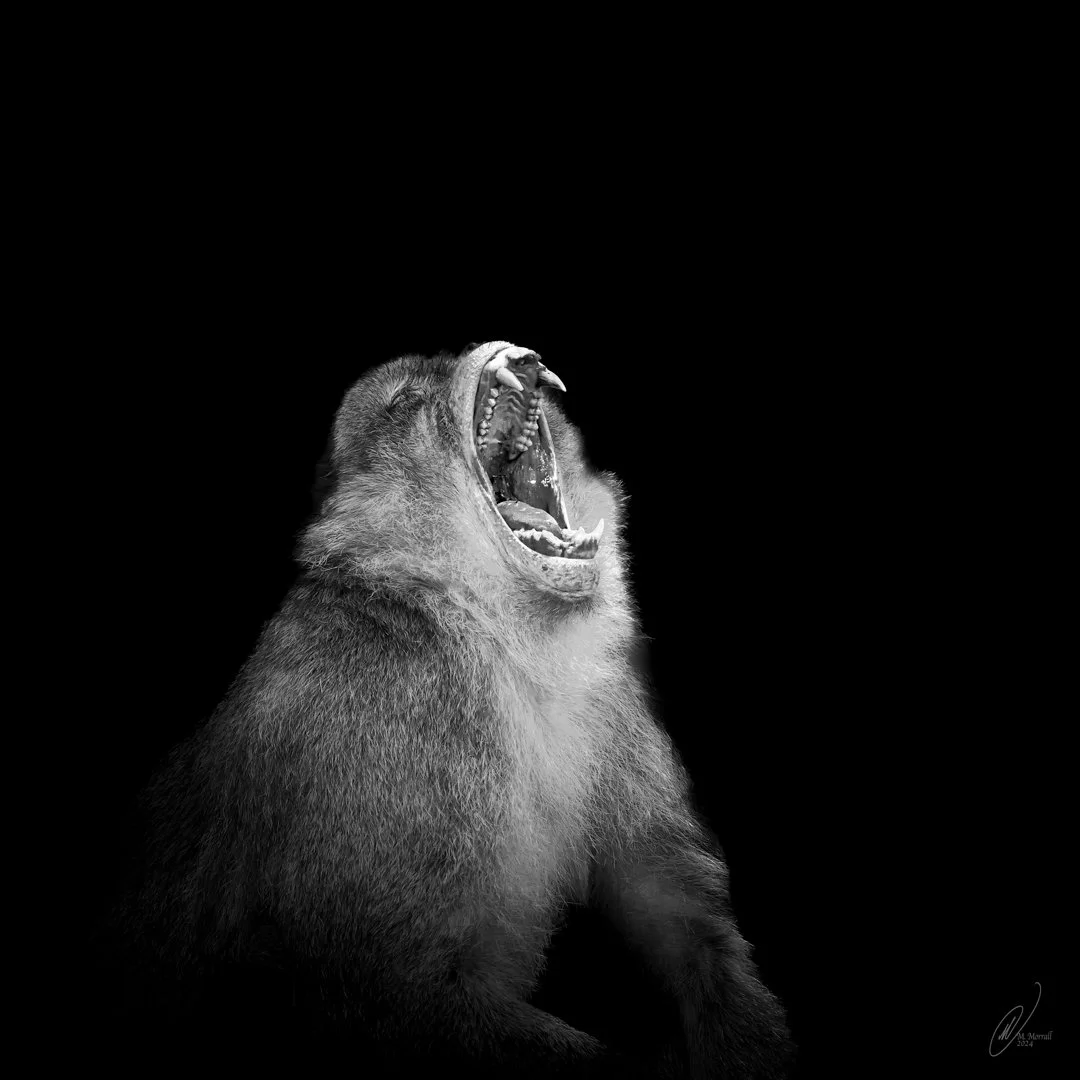 A majestic adult macaque caught mid-yawn, baring sharp teeth and fangs. This striking image is available as a limited edition print, with only 49 copies plus 2 artist’s proofs (AP) produced. Each print is meticulously signed, numbered, and dated by Mark, accompanied by a certificate of authenticity to ensure its exclusivity.