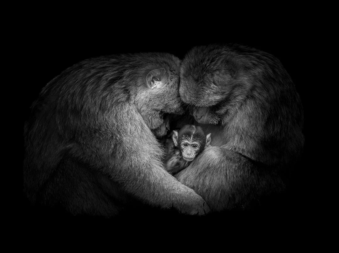 Celebrate the beauty of family bonds with this stunning black and white print of a monkey family embracing their young. Perfect for adding a touch of nature and affection to your space.